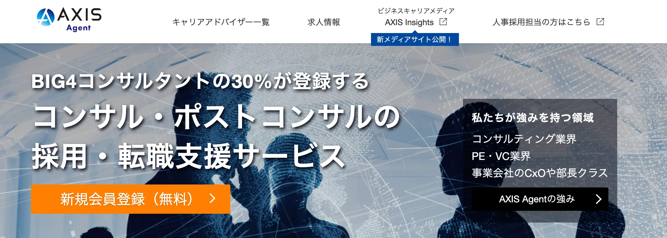 アクシスコンサルティングは、現役コンサルタントの支援実績が豊富で、ファームへの入社だけでなく、その後の「ポストコンサル」としてのキャリアまで見据えた提案が強みです。