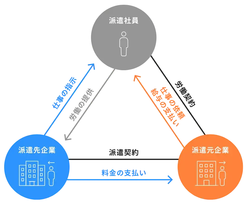 人材派遣は、「派遣会社」「派遣先企業」「派遣社員」の三者関係で成り立っています。