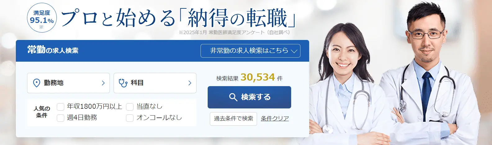 医師転職ドットコムは、医師の転職に特化した人材紹介サービスで、累計7.6万件以上の医師支援実績を誇ります。