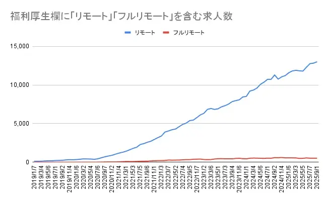 出典:PR TIMES-フルリモート求人は横ばい、リモート求人は直近1年で15.1%増加【2025年9月度 求人原稿 福利厚生トレンドレポート】