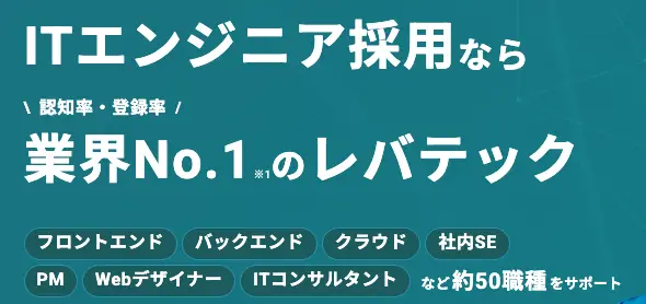 レバテックは、IT人材の紹介に特化したエージェントです。中途採用や業務委託契約、派遣など、採用ニーズに合わせて人材を紹介してもらえます。多くの登録者がいることから、幅広い職種とスキルから自社に合った即戦力と出会えます。
