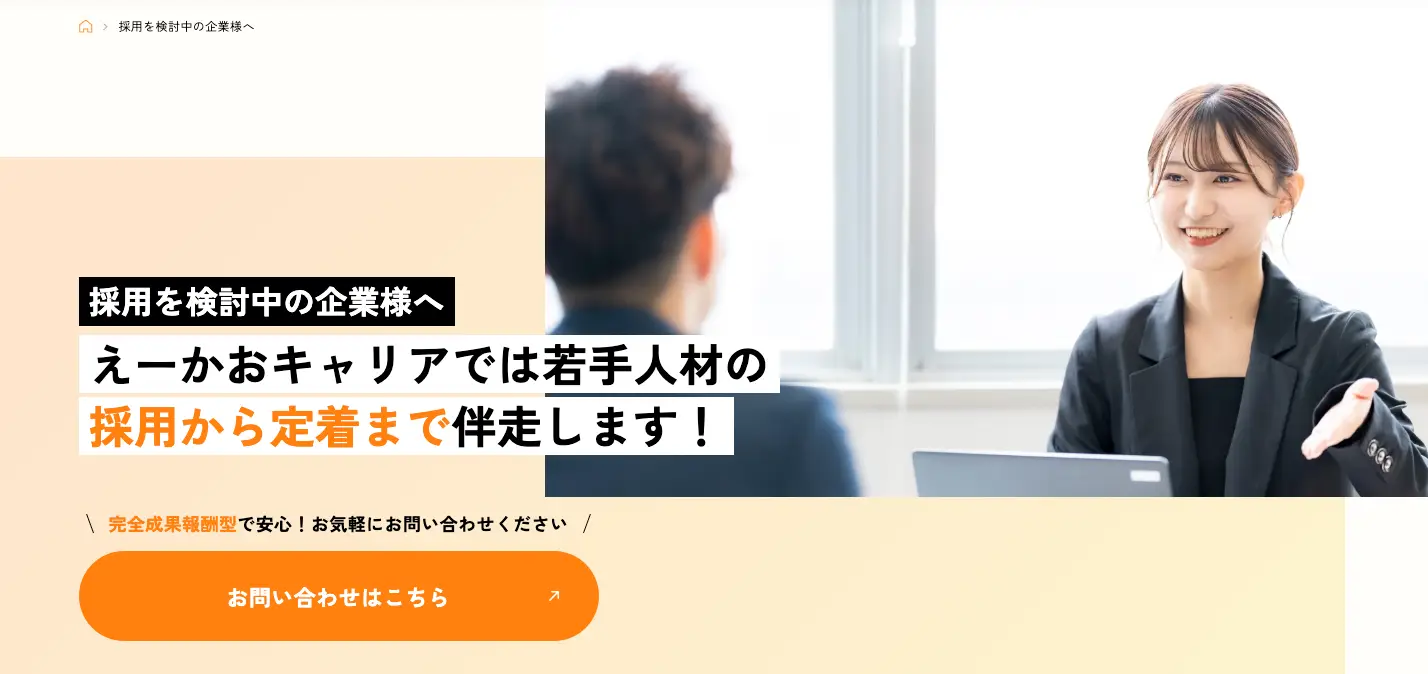 えーかおキャリアは、採用から定着まで支援する、若手人材の採用に特化したサービスです。特徴は、候補者ごとに合った求人を紹介し、深く理解してもらった上で面接に送り出す点です。採用のミスマッチを極限まで減らすことで、入社後の定着率が高くなっています。