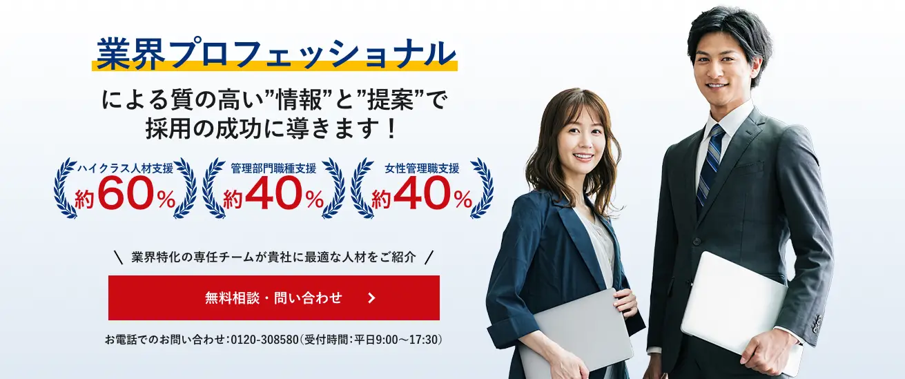 さらに、採用フローの改善提案や、データサービスを活用した企業からの直接アプローチなど、独自のサポート体制も特徴。業界特有の知見とノウハウをもとに、高精度のマッチングが期待できます。
