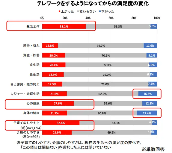 リモートワークによって、社員は仕事とプライベートが両立しやすくなります。「通勤が不要」「勤務地の選択肢が広がる」といった働き方の自由度の高さが、社員の満足度向上につながっています。実際、テレワークを継続している人の約4割が、生活全体の満足度が向上したと回答。特に「子育てのしやすさ」や「心の健康」の満足度が向上した、と回答した人が多くなっています。