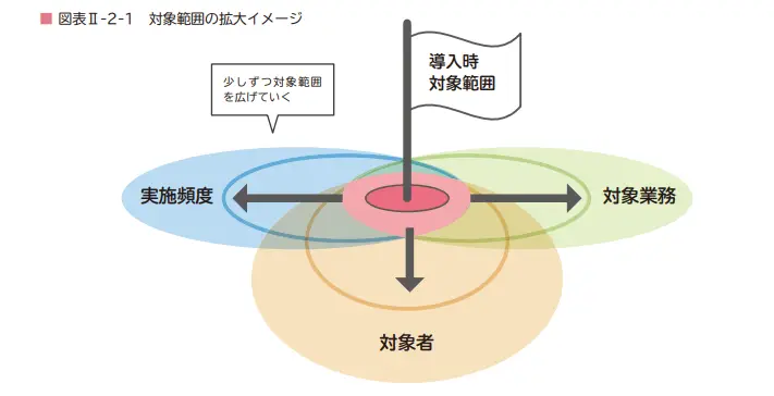 さらに「いきなり全社的にリモートワークを導入」ではなく、小規模単位で導入していくことをおすすめします。リモートワークを導入する際は、以下の図のように、対象業務の範囲や対象者、実施頻度を徐々に広げていきましょう。