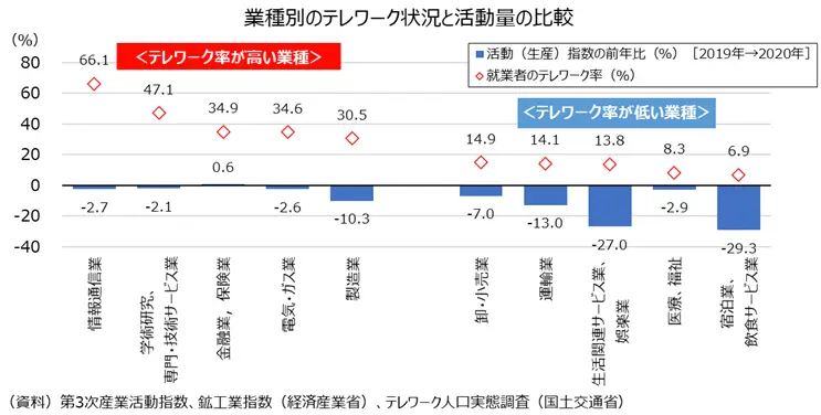 リモートワーク(テレワーク)は、災害やパンデミックといった突発的な事態が起きても、事業中断のリスクを最小限に抑えます。実際、新型コロナの感染拡大時には、テレワークの実施率が高い業種ほど、活動量の減少幅が小さいことがわかりました。(図参照)