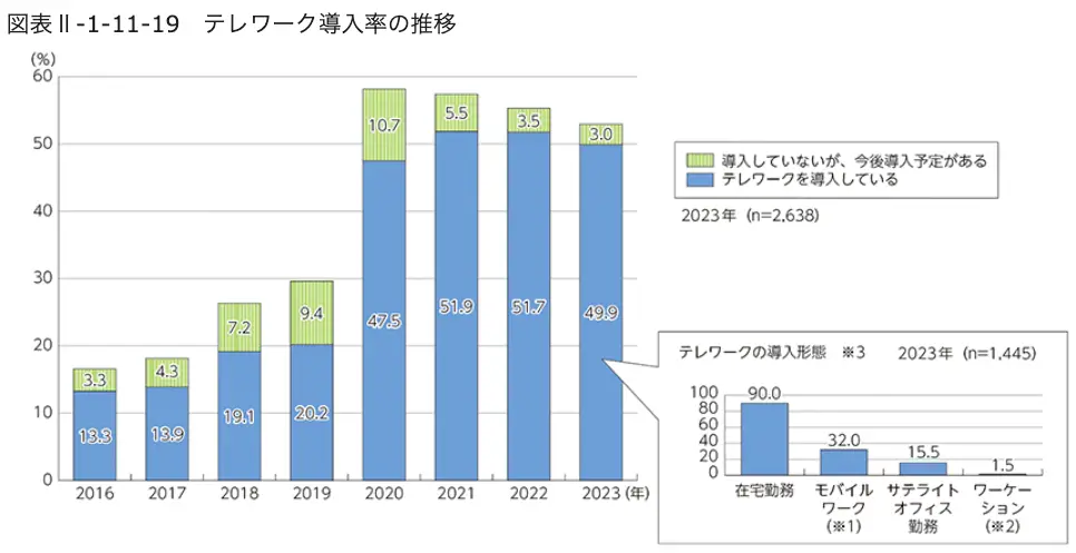 リモートワークとは、自宅やカフェ、コワーキングスペースなど、オフィスから離れた場所で仕事をする働き方のことです。働く場所に縛られない、柔軟なワークスタイルとして注目を集めています。リモートワーク(テレワーク)は、2020年の新型コロナの拡大を機に企業全体で導入が進みました。(図参照)