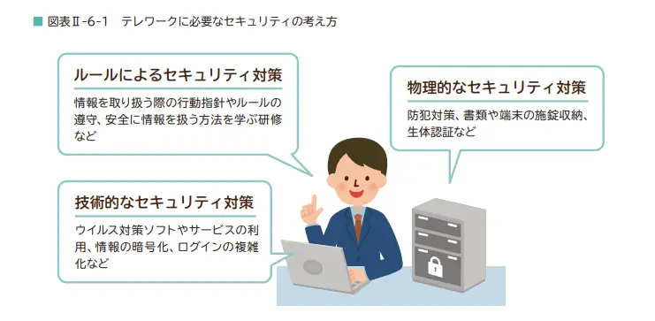 社員が在宅や外出先で業務を行う場合、セキュリティ対策が欠かせません。リモートワーク時のセキュリティ対策は、「ルール」「技術」「物理」の3つの観点で整備していきます。(図参照)