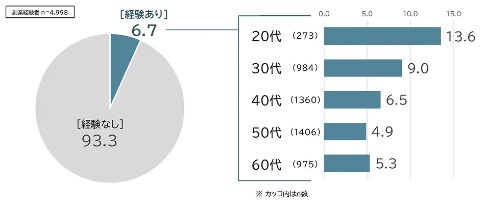 パーソル総合研究所の調査(2025年)によると、副業経験者約5,000人のうち、副業先の企業へ転職した経験が「ある」と答えた人は6.7%でした。割合は若い世代ほど高く、20代では13.6%に上ります。