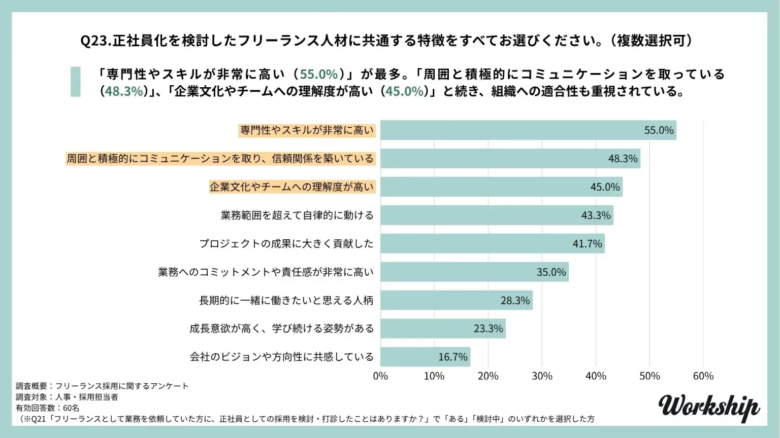 Workship MAGAZINEで発表された調査(2025年)によれば、トランジション採用(フリーランス・業務委託からの採用)の検討対象となる人材の特長に関して、企業から最も上がった回答は「専門性やスキルが非常に高い」(55.0%)という実務能力に関する項目でした。